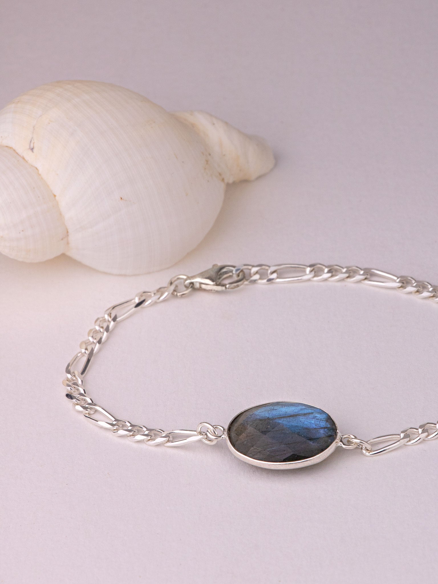 Ασημένιο χειροποίητο βραχιόλι με τον ορυκτό λίθο Λαμπραδορίτη και αλυσίδα καδένα κατασκευασμένο από ασήμι 925.