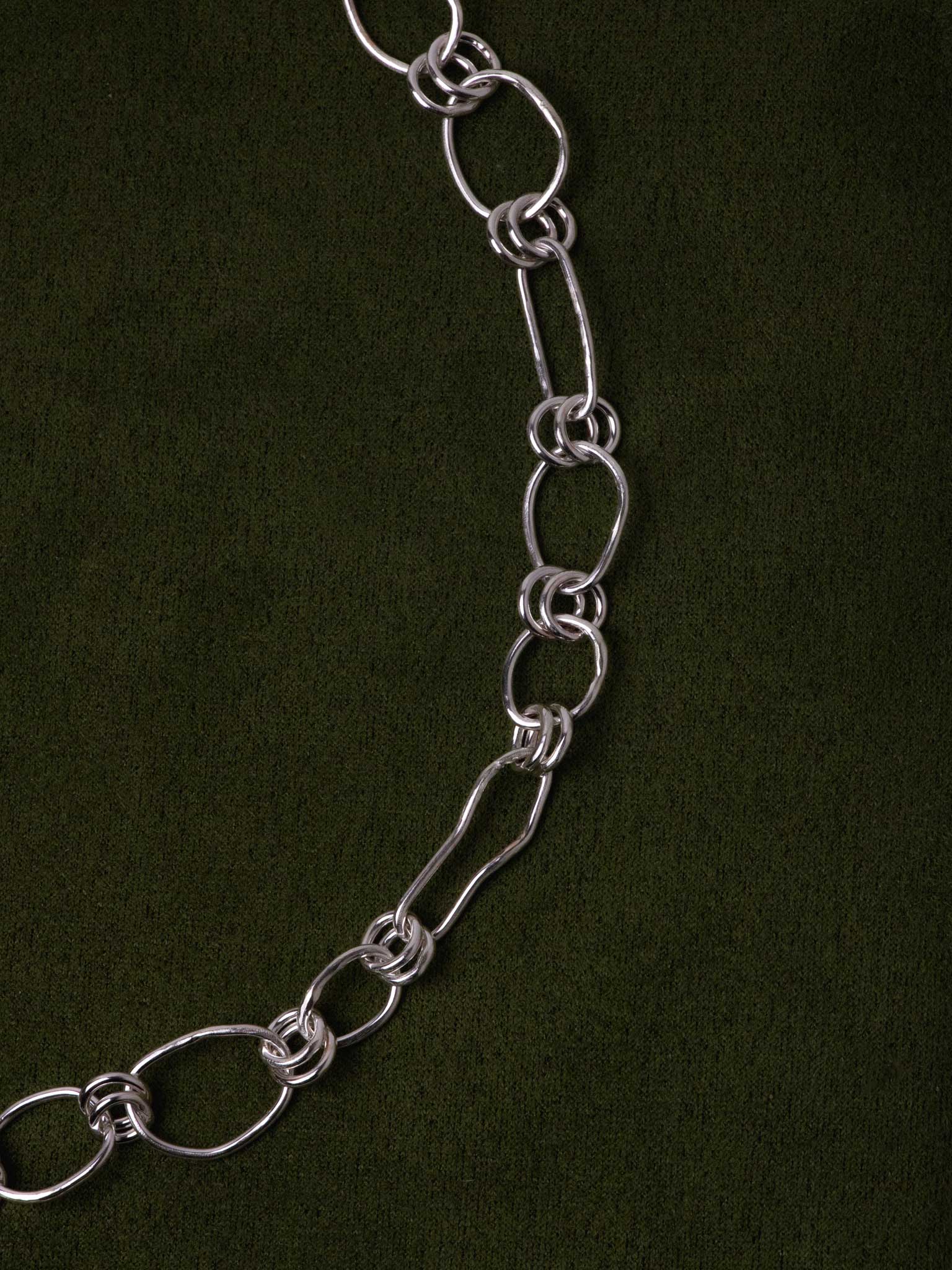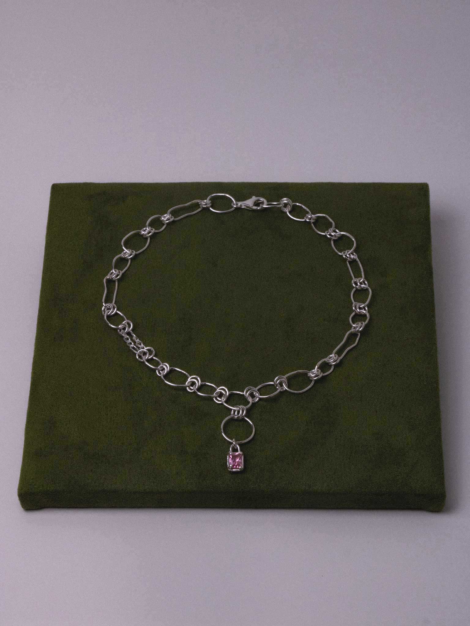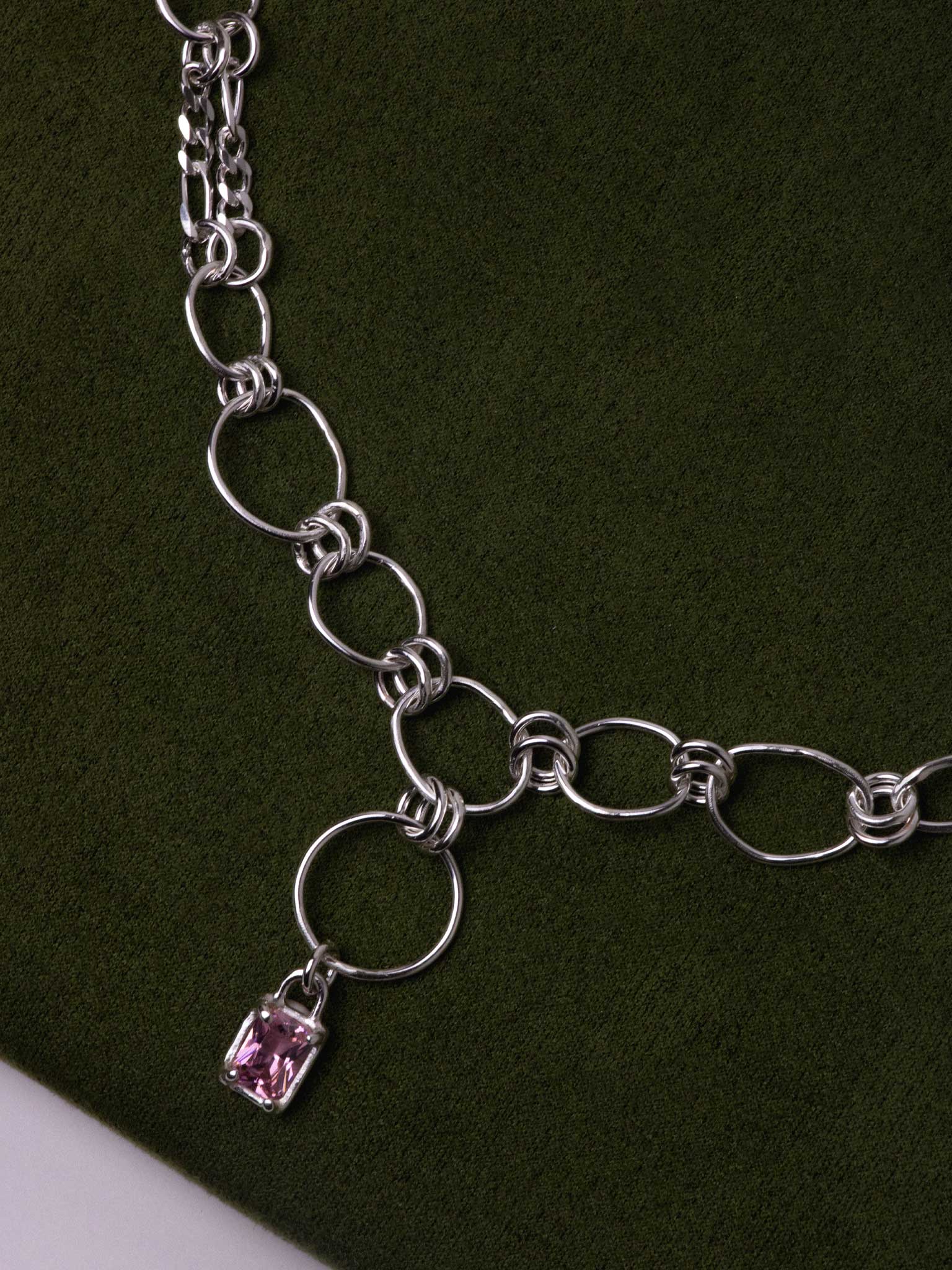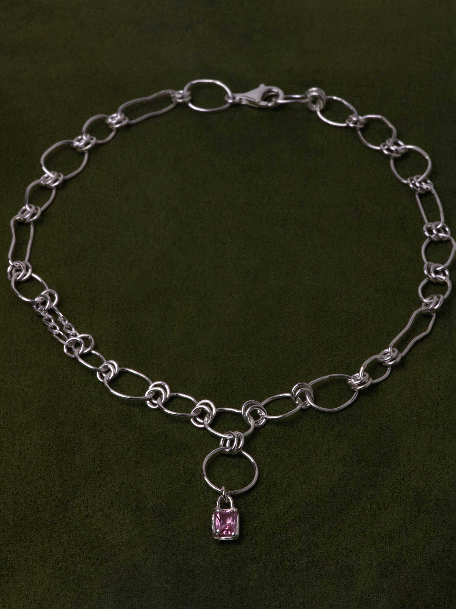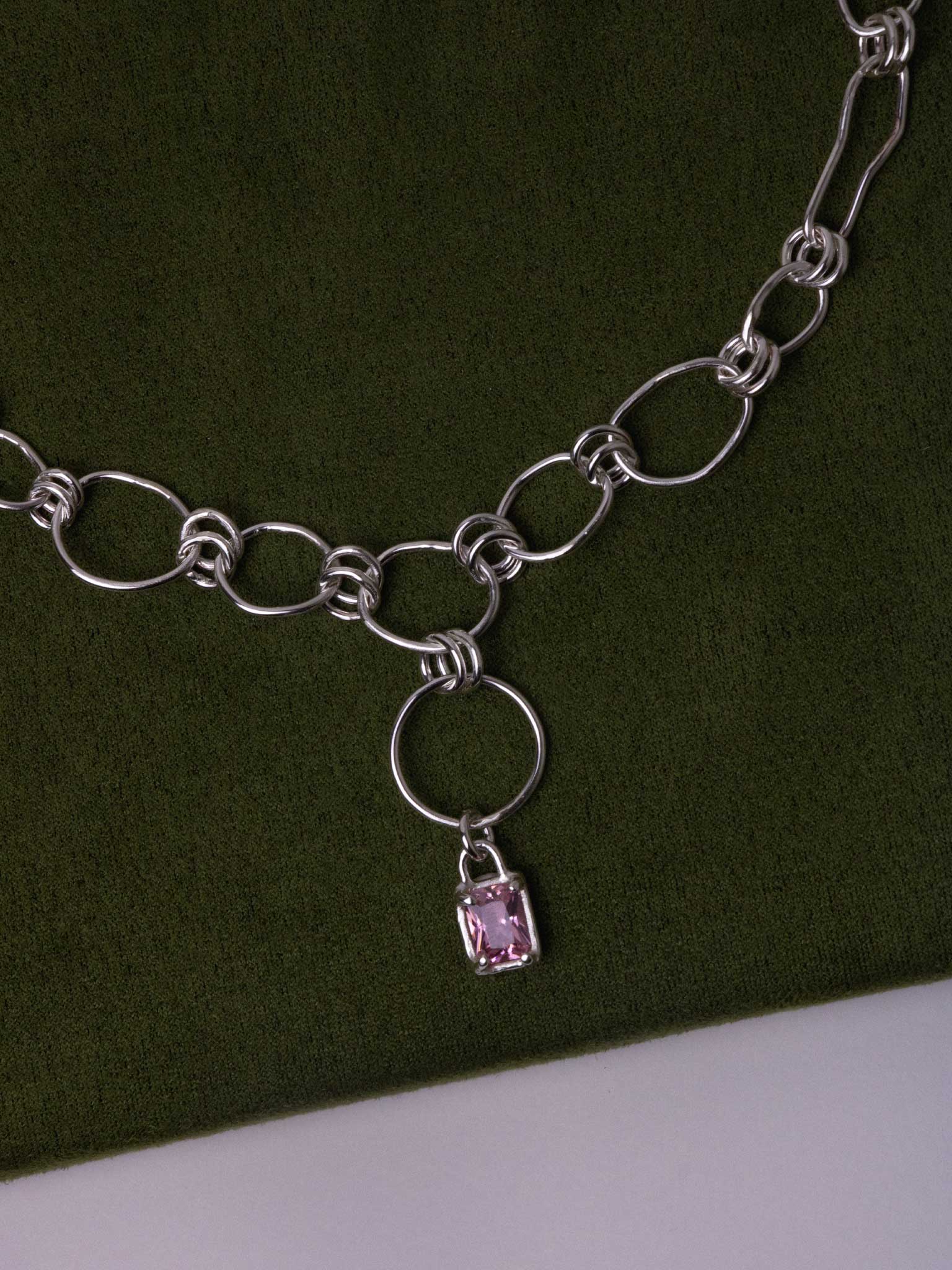 Κολιέ από χειροποίητη ασημένια αλυσίδα και ροζ Cubic Zirconia διαστάσεων 6x8 εκατοστών στο κέντρο. 100% χειροποίητο με κάθε κρίκο του να έχει διαμορφωθεί και κολληθεί ξεχωριστά στο χέρι.